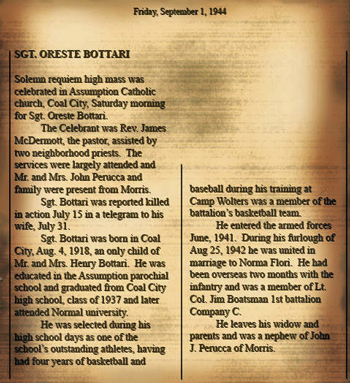 Oreste F Bottari, the only child of Henry and Kathryn Bottari, was born in Coal City, Illinois on August 4, 1918. He attended Assumption parochial school, graduated from Coal City High School, and attended Illinois State Normal university in 1937 - 1938. Prior to entering the service he was employed at the Atlas Wall Paper Mill. He registered for the draft on October 16, 1940. His draft card lists him as 5' 11" tall, 185 pounds, with blue eyes, brown hair, and a light complexion. He was inducted into the Army in Chicago, Illinois on June 19, 1941 and trained at Camp Wolters, Texas. While on furlough, he married Norma Flori on August 25, 1942.