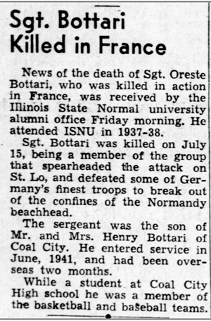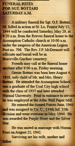 Sgt. Oreste F Bottari was a squad leader in the First Platoon, Company C, 134th Infantry Regiment. He was Killed in Action on July 15, 1944 during the battle for St. Lo, France. He was posthumously awarded a Silver Star Medal for gallantry for his actions during that battle. Sergeant Bottari is buried at Braceville-Gardner Cemetery, Braceville, Illinois.