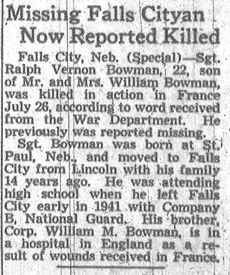 Ralph Vernon Bowman, the son of William and Zelphia Bowman, was born December 15, 1920 at St. Paul, Nebraska. He was inducted into the service on December 23, 1940 at Falls City, Nebraska. He landed on Omaha Beach in Normandy, France on July 5, 1944. He was promoted from Private First Class to Sergeant on July 22, 1944, serving as a squad leader. He was Killed in Action near St Lo, France on July 28, 1944 when, according to an eye witness, an artillery shell exploded nearby killing him instantly. Sgt Ralph V Bowman is buried at Steele Cemetery, Falls City, Nebraska.