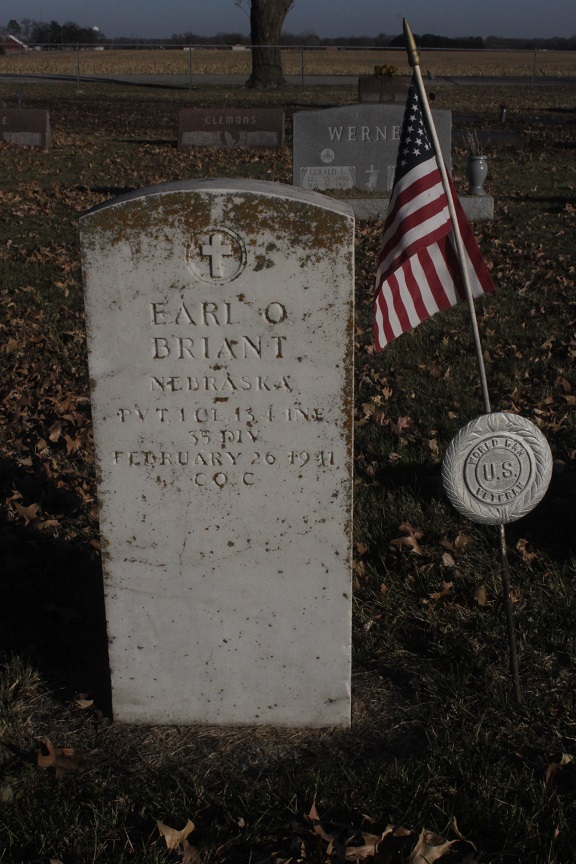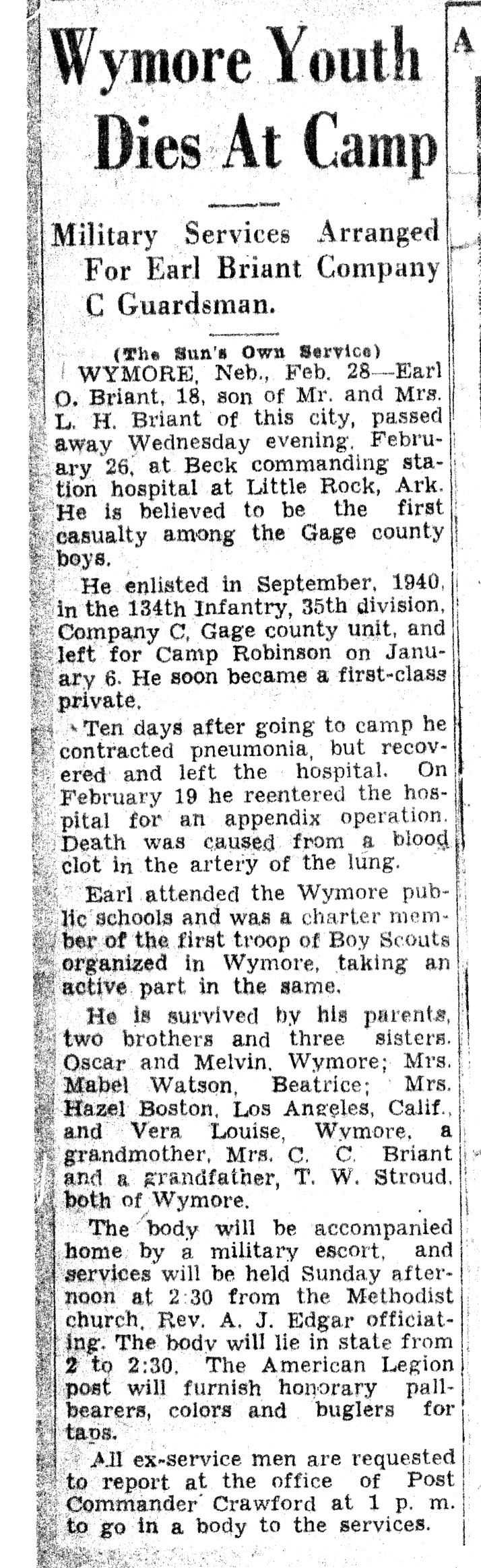 boys. He enlisted in September 1940, in the 134th Infantry, 35th Division, Company C, Gage county unit, and left for Camp Robinson on January 6. He soon became a first-class private. Ten days after going to camp he contracted pneumonia, but recovered and left the hospital. On February 19 he reentered the hospital for an appendix operation. Death was caused from a blood clot in the artery of the lung. Earl attended the Wymore public schools and was a charter member of the first troop of Boy Scouts organized in Wymore, taking an active part in the same. He is survived by his parents, two brothers and three sisters. Oscar and Melvin, Wymore; Mrs. Mabel Watson, Beatrice; Mrs. Hazel Boston, Los Angeles, Calif., and Vera Louise, Wymore, a grandmother, Mrs. C.C. Briant and a grandfather, T.W. Stroud, both of Wymore. The body will be accompanied home by a military escort, and services will be held Sunday afternoon at 2:30 from the Methodist church, Rev. A.J. Edgar officiating. The body will lie in state from 2 to 2:30. The American Legion post will furnish honorary pallbearers, colors and buglers for taps. All ex-service men are requested to report at the office of Post Commander Crawford at 1 p.m. to go in a body to the services. |