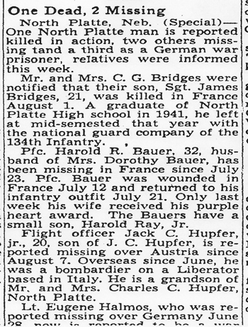 James P Bridges, the son of Charles and Marguriete Bridges, was born in Wyoming on July 10, 1922. Sometime during his youth the family relocated to Nebraska where he attended North Platte High School. He enlisted in the service on December 23, 1940 as a member of the Nebraska National Guard. Sgt Bridges was a squad leader in the First Platoon, Company D, 134th Infantry Regiment. He landed on Omaha Beach in Normandy, France on July 5, 1944 and fought in the battle at St. Lo. The morning of his death, the 134th Infantry Regiment was in position in the vicinity of Torigni sur Vire, France and in contact with the enemy. An advance southward was begun at 0830 and continued throughout the day. Sgt James P Bridges was Killed in Action on August 1, 1944. He is buried at Normandy American Cemetery, Colleville-sur-Mer, France.