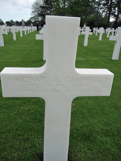 Pfc Richard E Campbell from Reading, Pennsylvania was born in 1922. He was inducted into the Army at Allentown, Pennsylvania on November 6, 1942. His enlistment records list him as single. He was an Automatic Rifleman in the 2nd Platoon, Company L and landed on Omaha Beach in Normandy on July 6, 1944. Pfc Richard E Campbell was Killed in Action during the battle for St Lo, France on July 17, 1944. He is buried at Normandy American Cemetery at Colleville-sur-Mer, France