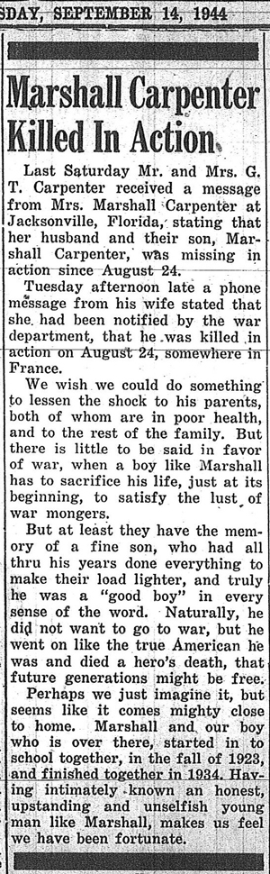 Sgt Marshall R Carpenter was Killed in Action on August 24, 1944 in the vicinity of Montargis, France. He is buried at Brittany American Cemetery, Montjoie Saint Martin, France.
