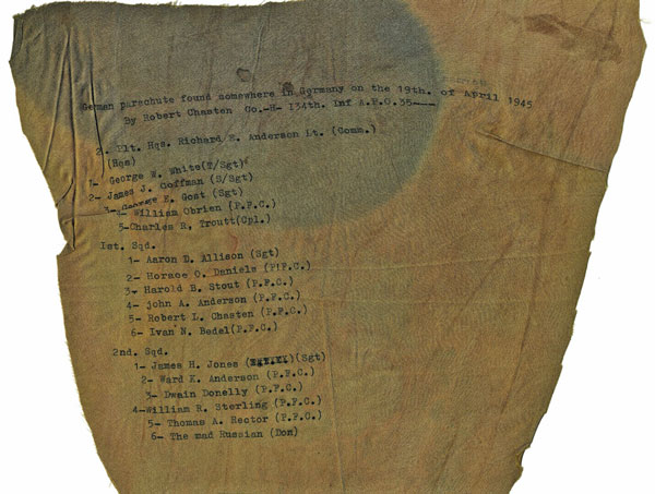 Another section of a German paracute with a roster of Second Platoon, Company H was found near the Elbe River on April 16, 1945.