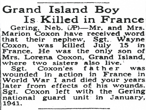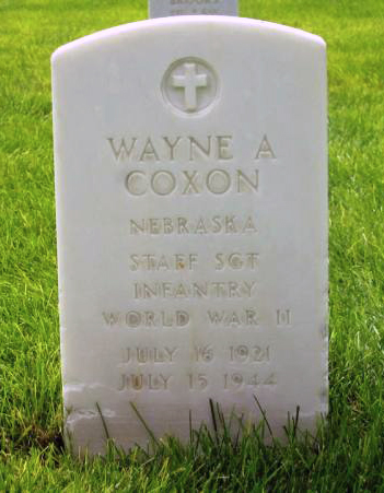 Wayne A Coxon, son of Wayne and Lorena (Keller) Coxon, was born in Nebraska on July 16, 1921. He was a member of the Nebraska National Guard, and served as a Section Leader in the Second Platoon, Company D. He was Killed in Action during the battle for St Lo, France on July 15, 1944.