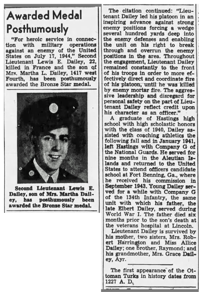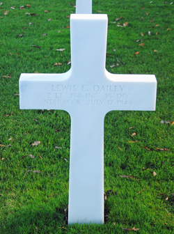 Lewis E Dailey, the son of Elbert and Martha (Mere) Dailey, was born in Iowa on June 4, 1922. The family relocated to Nebraska sometime during the 1920s. Lieutenant Dailey was Commander of the Second Platoon, Company L. He was seriously wounded in action on July 17, 1944 during the battle for St Lo, France and died of his wounds later that day. He was posthumously awarded the Bronze Star Medal for heroic action during that battle.