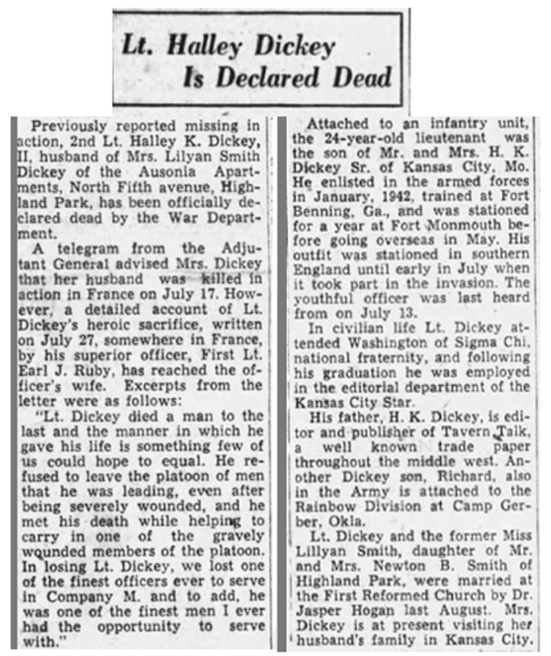 reported missing, he was Killed in Action July 17, 1944 near St Lo, France. He