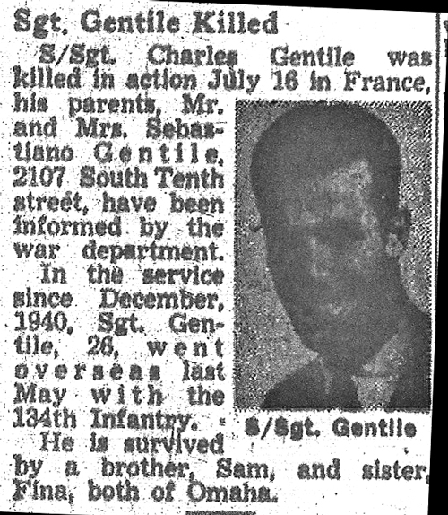 Charles Paul Gentile, son of Sabastiano and Guiseppina (Nocita) Gentile, was born in Omaha, Nebraska on July 9, 1918. He registered for the draft on October 16, 1940. His registration lists him as 5' 8" tall, weighing 143 pounds with brown eyes, brown hair and a light complextion. He was employed at Falstaff Brewing Company in Omaha. A member of the National Guard, he was inducted into the Army at Omaha on December 23, 1940.