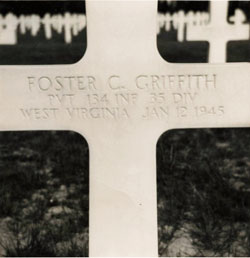 Pvt. Griffith was killed in action by small arms fire on Friday, January 12, 1945. At the time, his unit was attacking and clearing a wooded area about a mile and a half from Marvie, Belgium. He is buried at Luxembourg American Cemetery, Plot E, Row 2, Grave 38.