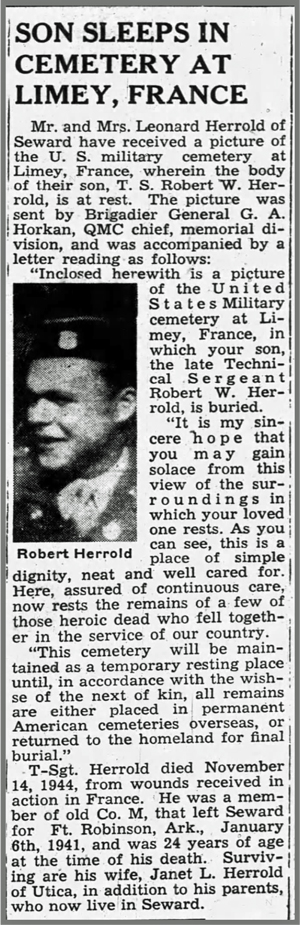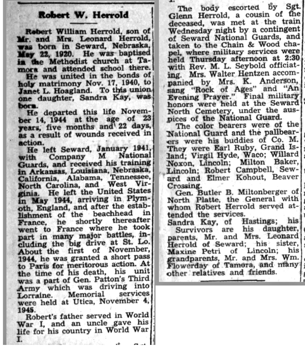Robert William Herrold, son of Leonard and Elsie (Flowerday) Herrold, was born in Seward, Nebraska on May 22, 1920. He married Janet L Hoagland on November 17, 1940. The couple had one child, a daughter, Sandra Kay. He was a member of the Nebraska National Guard, was inducted into the Army on December 23, 1940, and served in Company M, 134th Infantry Regiment. He landed on Omaha Beach in Normandy on July 6, 1944 and fought in numerous battles including those at St Lo, Mortain, and Nancy, France. T/Sgt Robert W Herrold was seriously wounded in action on November 14, 1944 near Morhange, France and died of his wounds that same day. He is buried at Seward Cemetery, Seward, Nebraska.