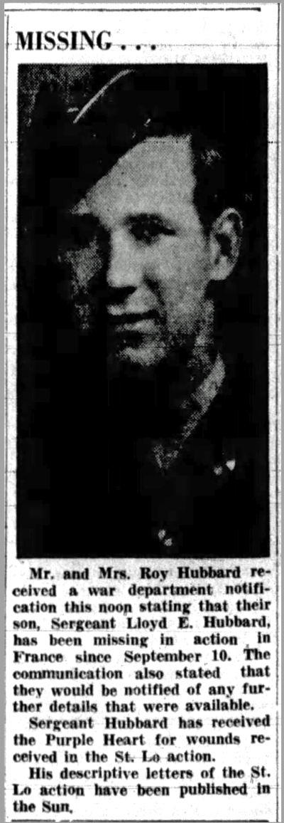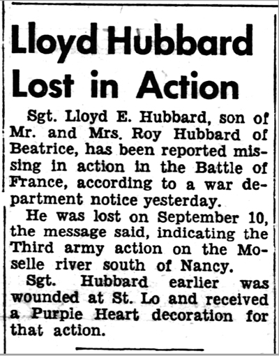 Lloyd E Hubbard, son of Roy Otmar and Viola May (Stevens) Hubbard, was born in Nebraska on April 10, 1922. He was a member of the Nebraska National Guard and was inducted into the Army December 23, 1940 at Beatrice, Nebraska. He served in Company C, 134th Infantry Regiment and landed on Omaha Beach, Normandy, France on July 5, 1944. He was wounded in action by shrapnel on July 16, 1944 during the battle for St Lo but he remained on duty. He was promoted from Private First Class to Sergeant on August 13, 1944. Originally reported missing in action, it was later confirmed that he was Killed in Action on September 10, 1944 along the Moselle River south of Nancy, France. He is buried at Lorraine American Cemetery, St Avold, France.