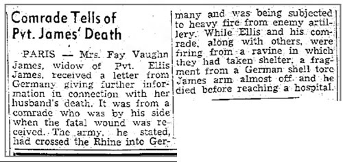 Ellis Eugene James, son of Bert Lester and Thelma Inez (Moore) James was born June 3, 1923 in Paris, Missouri. He married Faye Louise Vangher on March 2, 1944. He registered for the draft June 30, 1942 and was inducted into the Army July 21, 1944 at Jefferson Barracks, Missouri. He joined Company K, 134th Infantry Regiment as a Rifleman from the 38th Replacement Battalion January 17, 1945 when the unit was in Remichampagne, Belgium, about 6 miles southwest of Bastogne. Pfc Ellis E James was wounded in action March 26, 1945 near Dinslaken, Germany and died of his wounds that same day. He is buried at Netherlands American Cemetery, Margraten, Netherlands.