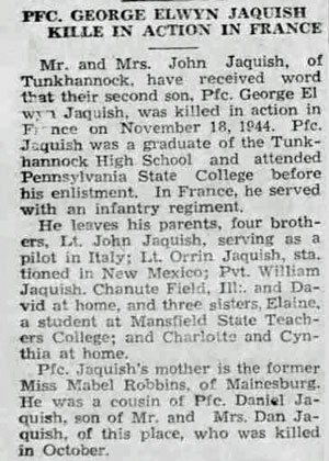 George Elvin Jaquish, son of John and Mabel (Robbins) Jaquish, was born December 27, 1921 in Mainesburg, Pennsylvania. He registered for the draft February 16, 1942 and was inducted into the Army December 26, 1942 at Wilkes Barre, Pennsylvania. He joined Company B, 134th Infantry Regiment as a Rifleman from the 38th Replacement Battalion October 1, 1944 when the unit was at Alincourt, France. Pfc George E Jaquish was killed in action by artillery shell fragments November 14, 1944 in the vicinity of Achain, France. He is buried at Lorraine American Cemetery, Saint Avold, France.