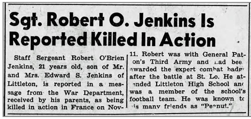 Robert O'Brien Jenkins, son of Edward Sanford and Maude Sinclair (Harris) Jenkins, was born January 25, 1923 in Halifax County, North Carolina. He registered for the draft June 30, 1942 and enlisted in the Army January 23, 1943 at Fort Bragg, North Carolina. He served in Company I, 134th Infantry Regiment as a Light Mortar Crew Member and landed at Omaha Beach, Normandy France July 6, 1944. He was promoted to Sergeant July 24 and to Staff Sergeant, Squad Leader August 9, 1944. S/Sgt Robert O Jenkins was killed in action by enemy small arms fire November 11, 1944 in the vicinity of Achain, France while directing mortar fire on an enemy pillbox. He is buried at Calvary United Church Cemetery, Littleton, North Carolina.