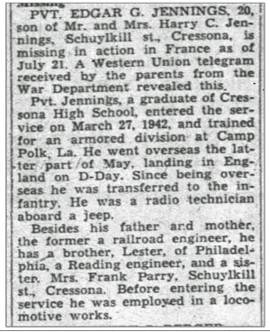 Edgar Guest Jennings, son of Harry Clay and Gertrude M (Fenstermacher) Jennings, was born February 7, 1924 in Cressona, Pennsylvania. He registered for the draft June 30, 1942, enlisted in the Army March 20, 1943 at Allentown, Pennsylvania and trained at Camp Polk, Louisiana before departing for the ETO in late May 1944. He joined Company K, 134th Infantry Regiment as a Scout from the 86th Replacement Battalion July 20, 1944 when the unit was in the vicinity of St Lo, France. He transferred to Company L August 19, 1944 and was promoted to Sergeant, Squad Leader. Sgt Edgar G Jennings was initially reported missing September 17, 1944 in the vicinity of Nancy, France and was later confirmed killed in action by small arms fire on that date. He is buried at Lorraine American Cemetery, Saint Avold, France.