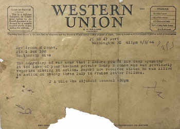 Henry Milford Jones, son of Henry Joseph and Velma (Cole) Jones, was born October 8, 1922 in Simpson County, Mississippi. He registered for the draft June 30, 1942 and enlisted in the Army March 3, 1943 at Camp Shelby, Mississippi. He married Gency Irene Middleton sometime prior to his enlistment. He joined Company M, 134th Infantry Regiment as an Ammunition Handler from the 86th Replacement Battalion July 21, 1944. Pvt Henry M Jones was initially reported missing July 23, 1944 in the vicinity of St Lo, France and was later confirmed killed in action on that date. He is buried at Old Good Hope Cemetery, Martinville, Mississippi.