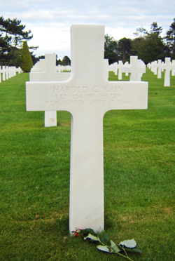 1st Lt Harold C Kain was a platoon commander in Company E, 134th Infantry Regiment. He was Killed in Action July 17, 1944 during the battle for St Lo, France and is buried at Normandy American Cemetery, Colleville-sur-Mer, France.