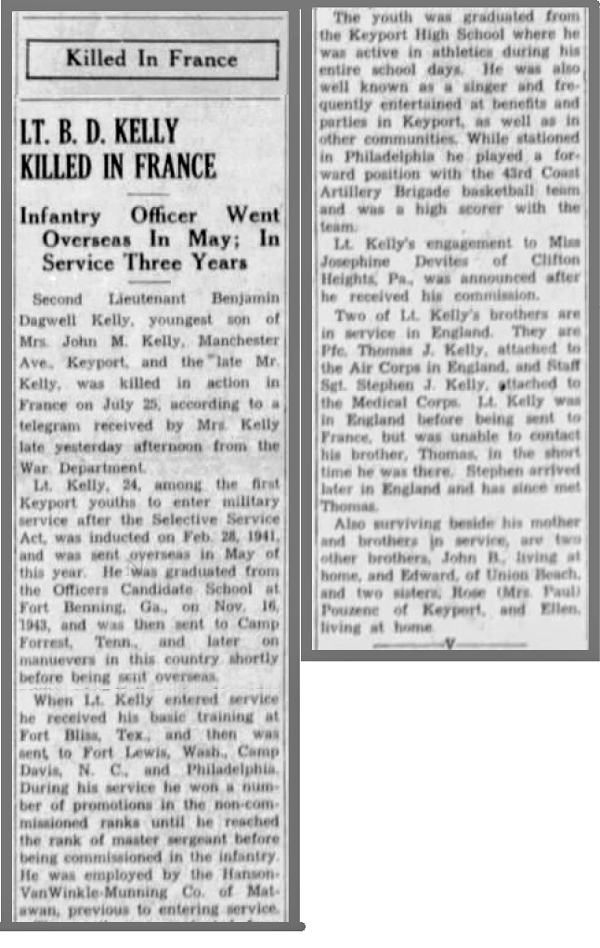 Benjamin Dagwell Kelly, the son of John Michael and Emma Caroline (Kaltenbacher) Kelly was born in New Jersey about 1920. He was inducted into the Army February 28, 1941, received his basic training at Fort Bliss, Texas and attended Officers Candidate School at Fort Benning Georgia. 2nd Lt Benjamin D Kelly served as a Reconnaissance Officer in the Anti Tank Company, 134th Infantry Regiment. He was Killed in Action in the vicinity of St Lo, France on July 25, 1944. 2nd Lt Benjamin D Kelly is buried at Normandy American Cemetery, Colleville-sur-Mer, France.