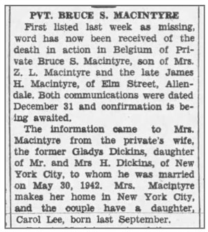 Bruce Stewart MacIntyre, son of James Harvey and Zola Leota (Stewart) MacIntyre, was born October 15, 1915 in Chatham, New Jersey. He married Gladys Marie Dickens May 30, 1942 and the couple had a daughter, Carol Lee. He registered for the draft October 16, 1940. At the time he was living in Jackson Heights, Queens, New York and working at the Ford Motor Company in Flushing. He was inducted into the Army May 3, 1943 at Newark, New Jersey and joined Company F, 134th Infantry Regiment from the 38th Replacement Battalion September 30, 1944 when the unit was in the vicinity of Armaucourt, France. He transferred to Company E October 9, 1944 and was promoted to Private First Class December 1, 1944. He was wouded by shrapnel December 15, 1944 in the vicinity of the Bannholz Woods in France but remained on duty. Pfc Bruce S MacIntyre was originally reported missing and was later confirmed killed in action by small arms fire December 31, 1944 300 yards east of Sainlez, Belgium. He is buried at Luxembourg American Cemetery, Hamm, Luxembourg.