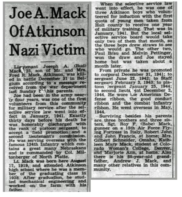 Joseph Andrew Mack, son of Fred Roy and Ella (Prussa) Mack, was born August 17, 1919 in Atkinson, Nebraska. He registered for the draft October 16, 1940 and was inducted into the Army February 19, 1941. He was a member of the Anti-Tank Platoon, Headquarters Company 2nd Battalion, 134th Infantry Regiment and landed at Omaha Beach July 6, 1944. He was promoted from Technical Sergeant and commissioned 2nd Lieutenant December 1, 1944. 2nd Lt Joseph A Mack was killed in action December 31, 1944 by machine gun fire in the vicinity of Lutrebois, Belgium. He was awarded a Silver Star Medal for gallantry during the battle in which he died. He is buried at Saint Joseph Cemetery, Atkinson, Nebraska.