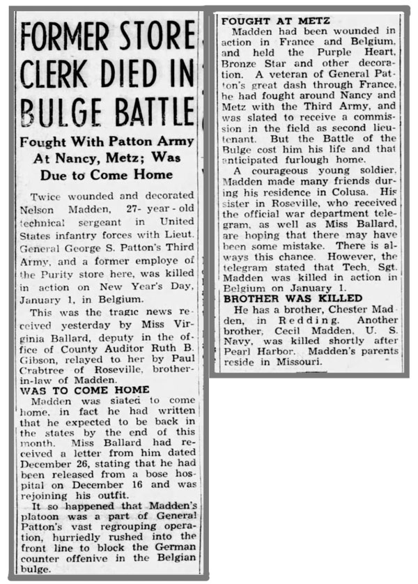 Nelson Elisha Madden, son of William Elisha and Nancy Elizabeth (Shaw) Madden, was born February 13, 1916 in Puxico, Missouri. He registered for the draft October 16, 1940. At the time he was living in Orland Glenn, California. He was inducted into the Army February 10, 1942, served in Company C, 134th Infantry Regiment, and landed at Omaha Beach in Normandy France July 5, 1944. He was promoted to Sergeant July 17 and to Staff Sergeant, Squad Leader August 11, 1944. He was wounded by shrapnel November 14 in the vicinity of Morhange, France and returned to duty with Company C on December 14, 1944 when the unit was in the vicinity of Sarreguemines, France. He was again promoted to Technical Sergeant December 19, 1944. T/Sgt Nelson E Madden was killed in action January 1, 1945 in the vicinity of Lutrebois, south of Bastogne, Belgium. He was originally buried at the Lorraine American Military Cemetery in France and was laid to final rest at Rock Hill Cemetery, Puxico, Missouri.