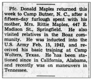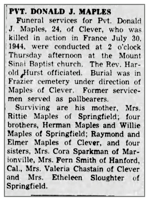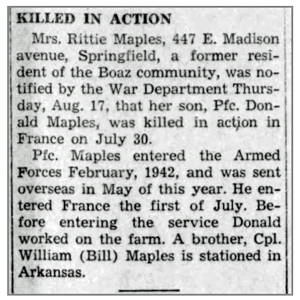 Pfc Donald J Maples was killed in action July 30, 1944 in the vicinity of