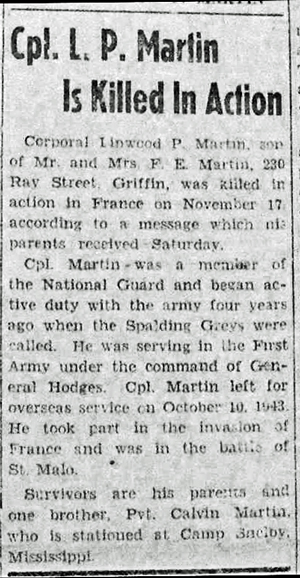 Linwood P Martin, son of Fred Eugene and Mary Maloney (Sparks) Martin was born in Georgia April 12, 1922. He was a member of the Georgia National Guard and was inducted into the Army September 16, 1940 at Jackson, Georgia and joined Company L, 134th Infantry Regiment as a Squad Leader from the 38th Replacement Battalion August 28, 1944 while the unit was in the vicinity of Saint Florentin, France. Cpl Linwood P Martin was killed in action by enemy small arms fire November 17, 1944 in the vicinity of Morhange, France. He is buried at Oak Hill Cemetery, Griffin, Georgia.