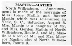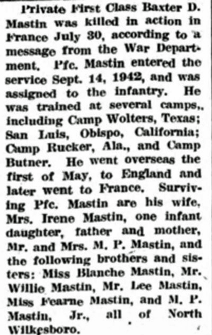 Baxter Duncan Mastin, son of Monroe Peden and Bessie Alice (Myers) Mastin, was born July 30, 1921 in Ronda, North Carolina. He married Irene Mathis August 8, 1942 and the couple had a daughter. He registered for the draft February 16, 1942 and was inducted into the Army August 31, 1942 at Camp Croft, South Carolina. He served as a Rifleman in the First Platoon, Company F, 134th Infantry Regiment and landed at Omaha Beach Normandy, France July 5, 1944. Pfc Baxter D Mastin was killed in action by an artillery blast July 30, 1944 in the vicinity of Conde-sur-Vire, France. He is buried at Fishing Creek Arbor Baptist Church Cemetery, Wilkesboro, North Carolina.