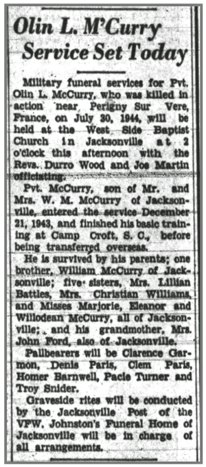Olin Lytelle McCurry, son of William and Ethel Lou (Ford) McCurry, was born June 16, 1923 in River Junction, Florida. He registered for the draft June 30, 1942. At the time he was living in Jacksonville, Alabama and working at the Profile Cotton Mill in Jacksonville. He was inducted into the Army November 11, 1943 at Fort McClennan, Alabama and joined Company B, 134th Infantry Regiment as a Rifleman from the 86th Replacement Battalion July 20, 1944 when the unit was in the vicinity of St Lo, France. Pvt Olin L McCurry was seriously wounded in action July 30, 1944 in the vicinity of Torigini Sur Vire, France and died of his wounds that same day. He is buried at Four Mile Cemetery, Four Mile, Alabama.