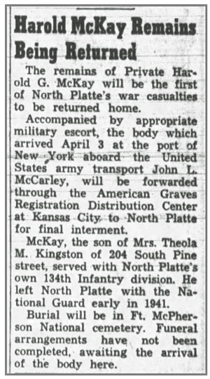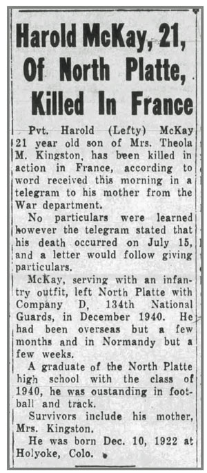 Harold G McKay, son of Theola McKay, was born December 10, 1922 in Holyoke, Colorado and moved to Nebraska sometime prior to 1940. He was a member of the Nebraska National Guard, mobilized to Federal service December 23, 1940 at North Platte, Nebraska, and served as a Heavy Machine Gunner in the Second Platoon, Company D, 134th Infantry Regiment. Pvt Harold G McKay was killed by a mortar shell blast July 15, 1944 in the vicinity of St Lo, France and was awarded a Silver Star Medal for gallantry during the battle in which he died. He is buried at Fort McPherson National Cemetery, Maxwell, Nebraska.