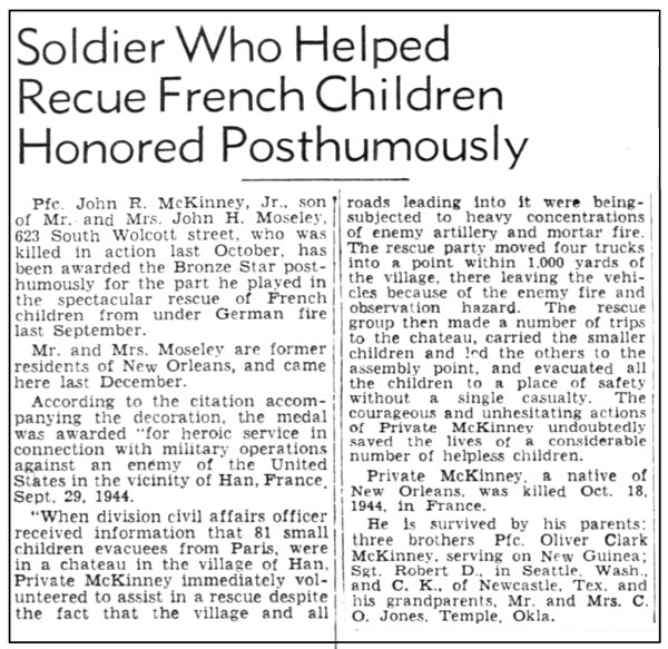 Private John R McKinney Jr, 38616429, Infantry, United States Army, for heroic service in connection with military operations against an enemy of the United States in the vicinity of Han, France, on 29 September 1944. When the civil affairs officer received information that eighty-one small children, evacuees from Paris, were in a chateau in the village of Han, France, Private McKinney immediately volunteered to assist in a rescue despite the fact that the village and all roads leading into it were being subjected to heavy concentrations of enemy artillery and mortar fire. The rescue party moved four trucks to a point within one thousand yards of the village, there leaving the vehicles because of the enemy fire and observation hazard. The rescue group then made a number of trips to the chateau, carried the smaller children and led the others to the assembly point, and evacuated all the children to a place of safety without a single casualty. The courageous and unhesitating actions of Private McKinney undoubtedly saved the lives of a considerable number of helpless children. Entered military service from Louisiana. General Orders No. 44, Headquarters 35th Infantry Division, 16 October 1944 |