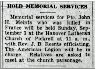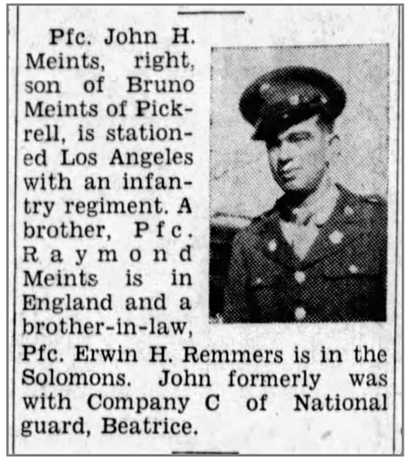Pfc John H Meints was born in Nebraska on June 13, 1913. He was a member of the Nebraska National Guard and served as a Light Machine Gunner in Weapons Platoon, Company C, 134th Infantry Regiment. He was Killed in Action July, 15, 1944 during the battle for St Lo, France. He is buried at Normandy American Cemetery, Colleville-sur-Mer, France.