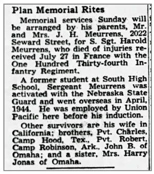 Harold Arthur Meurrens, son of Joseph Henry and Mable Ella (Fink) Meurrens was born in Kansas on April 4, 1919 and moved to Nebraska sometime during the 1920's. He was a member of the Nebraska National Guard, mobilized to Federal Service December 23, 1940 at Omaha, Nebraska. He served in the Third Platoon, Company L, 134th Infantry Regiment and landed at Omaha Beach, Normandy France on July 6, 1944. He was promoted to Staff Sergeant, Squad Leader July 20, 1944. S/Sgt Harold A Meurrens was wounded in action July 27, 1944 in the vicinity of St Lo, France and died of his wounds that same day. He is buried at Brittany American Cemetery, Saint James, France.