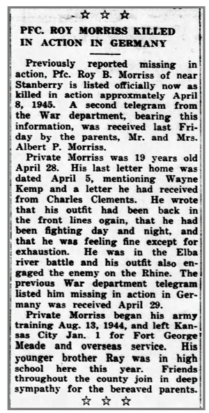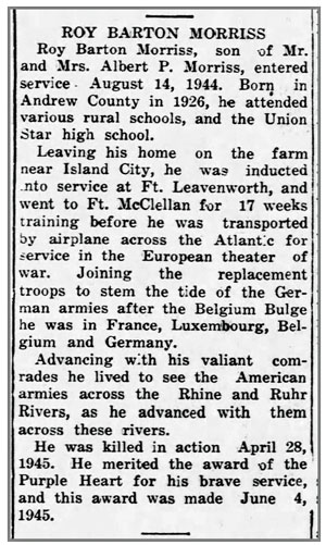 Roy Barton Morriss, son of Albert Pearl and Bonnie Mae (Hall) Morriss, was born April 28, 1926 in Filmore, Missouri. He registered for the draft April 29, 1944 and was inducted into the Army August 16, 1944 at Fort Leavenworth, Kansas. He joined Company I, 134th Infantry Regiment as a Rifleman from the 53rd Replacement Battalion January 27, 1945 when the unit was in the vicinity of Heinerscheid, Luxembourg and he was promoted to Private First Class February 15, 1945. Pfc Roy B Morriss was a member of a reconnaissance patrol sent to reconnoiter a crossing of the Rhine-Herne canal about 1/2 mile south of Buer Erle, Germany. While attempting to cross the canal, their boat came under machine gun fire and the patrol was forced to abandon the boat near the far bank. According to another member of the patrol, Pfc Morriss was last seen jumping from the boat. He was originally reported missing and was later confirmed killed in action on April 8, 1945. He is buried at Savannah Cemetery, Savannah, Missouri.