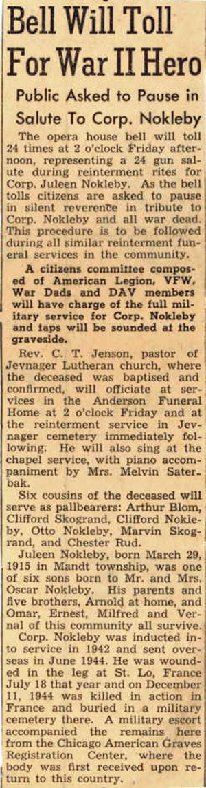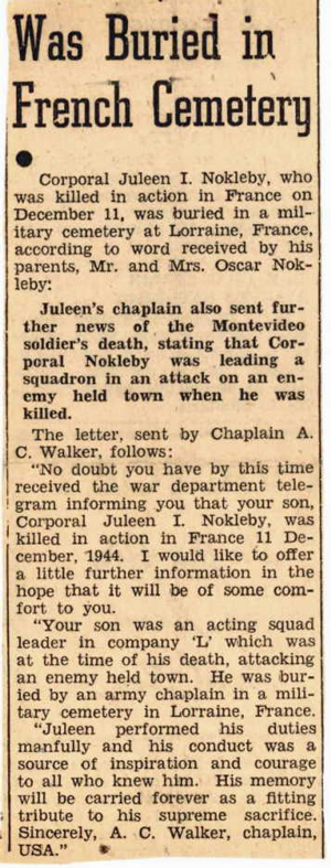 James Aloysius Noice, son of Perry Joseph and Rose Frances (Evans) Noice, was born October 9, 1920 in Lancaster, Ohio. He was inducted into the Army September 25, 1942 and joined Company K, 134th Infantry Regiment July 17, 1944 from the 86th Replacement Battalion when the unit was in the vicinity of St Lo, France. He was wounded by shrapnel September 22, 1944 in the vicinity of Agincourt, France and returned to duty December 31, 1944. Pfc James A Noice was killed in action January 28, 1945 by concussion from an artillery/mortar blast in the vicinity of Heinerscheid, Luxembourg. He was originally interred at Luxembourg American Cemetery and was laid to final rest in 1948 at Saint Mary Catholic Cemetery, Lancaster, Ohio.