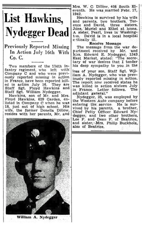 William August Nydegger, son of Edward Earnest and Mary Ellen (Davis) Nydegger, was born in Carthage, Missouri on April 6, 1919. His family moved to Nebraska sometime during 1919 - 1920. He registered for the draft on October 16, 1940. His draft record lists him as 5' 10 1/2" tall, weighing 155 pounds, with blue eyes, brown hair, and a light complexion. He joined the Nebraska National Guard and was activate for Federal Service on December 23, 1940 at Beatrice, Nebraska. S/Sgt William A Nydegger was a Section Leader in Weapons Platoon, Company C, 134th Infantry Regiment. First reported missing, he was confirmed Killed in Action July 16, 1944 during the battle for St Lo, France. He is buried at Normandy American Cemetery, Colleville-sur-Mer, France.