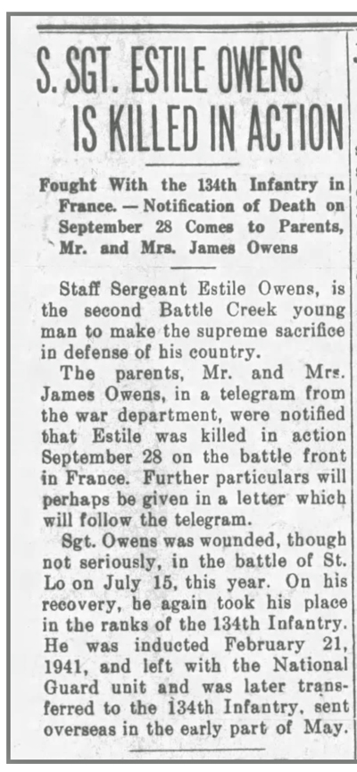 Estile Ira Owens, son of James Wiley and Beadie Cedella (Hawks) Owens was born January 15, 1920 in Battle Creek, Nebraska. He registered for the draft on February 5, 1941. He served as a Squad Leader in Weapons Platoon, Company L, 134th Infantry Regiment. He was wounded by a shell blast on July 15 during the battle for St Lo, France and returned to duty August 19, 1944. He was promoted from Sergeant to Staff Sergeant on August 29, 1944. S/Sgt Estile I Owens was Killed in Action north of Nancy, France September 28, 1944. He is buried at Lorraine American Cemetery, Saint-Avold, France.