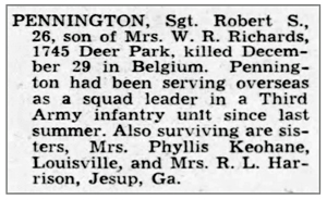 Robert Stanley Pennington, son of Ralph Lewis and Glady (Lehr) Pennington, was born September 23, 1918 in Lincoln, Nebraska. He registered for the draft October 16, 1940. At the time he was living in Louisville, Kentucky and working at the J. G. McCrory Corporation. He was inducted into the Army June 11, 1941 in Louisville. Originally a member of the 26th Infantry Division, he joined Company B, 134th Infantry Regiment on December 16, 1944 and served as a Squad Leader. Sgt Robert S Pennington was killed in action December 29, 1944 vicinity of Marvie, south of Bastogne, Belgium while directing artillery fire on enemy positions from a house he was using as on observation point. He is buried at Luxembourg American Cemetery, Hamm, Luxembourg.