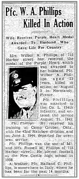 Wilbur Allen Phillips, son of Russell Merle and Alice (Lavarack) Phillips, was born June 7, 1921 in Monongahela, Pennsylvania. He was married to Mary Jean Sesko. He registered for the draft February 16, 1942. At the time he was living in New Castle, Pennsylvania and working at the Carnegie Illinois Steel Corporation. He was inducted into the Army July 31, 1943 at Pittsburgh, Pennsylvania and joined Company L, 134th Infantry Regiment from the 86th Replacement Battalion July 17, 1944 serving as a Rifleman. He was wounded by shrapnel July 31, 1944 in the vicinity of Torigini Sur Vire, France but remained on duty. Pfc Wilbur A Phillips was killed in action August 3, 1944 in the vicinity of Vire, France. He is buried at Graceland Cemetery, New Castle, Pennsylvania.