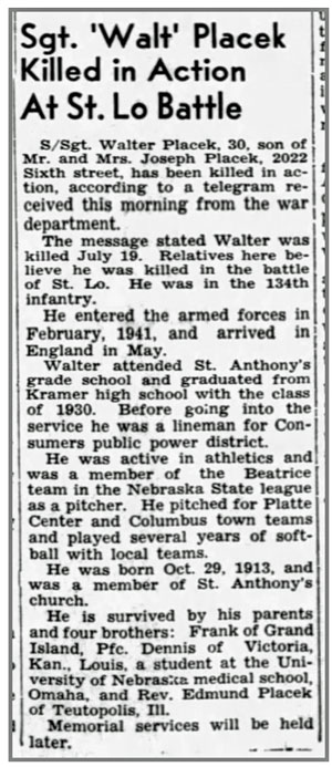 Walter Frank Placek, son of Joseph and Mary (Smolen) Placek, was born October 29, 1913 in Columbus, Nebraska. He registered for the draft October 16, 1940. At the time he was working for the Consumers Public Power District in Columbus. He entered the Army in February 1941, served as a Platoon Sergeant in the First Platoon, Company K, 134th Infantry Regiment, and landed at Omaha Beach in Normandy, France July 6, 1944. S/Sgt Walter F Placek was killed in action July 19, 1944 during the battle for St Lo, France. He is buried at Normandy American Cemetery, Colleville-sur-Mer, France.