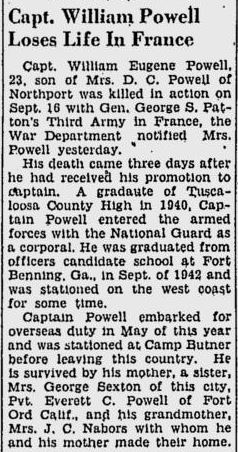 Captain William Eugene Powell served in Company E, 134th Infantry Regiment. He was wounded in action just south of St Lo, France July 30, 1944 but remained on duty. He was awarded a Bronze Star Medal for heroic service in the vicinity of Mortain, France on August 8 and on August 26, 1944 he led a patrol that captured 45 enemy prisoners in the vicinity of Joigny, France. He was promoted from 1st Lieutenant to Captain on September 9 and was Killed in Action September 16, 1944 while securing a bridgehead across the Meurthe River in the vicinity of Nancy, France. Capt William E Powell is buried at Jefferson Barracks National Cemetery in St Louis, Missouri.