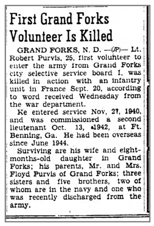 Robert Samuel Purvis, son of Floyd Walker and May Violet (Amble) Purvis, was born April 5, 1919 in Fargo, North Dakota. He married Cleo Marie Cannon and the couple had one child, a daughter. He registered for the draft October 16, 1940 while living in Grand Forks, North Dakota and was inducted into the Army November 27, 1940. He was commissioned 2nd Lieutenant October 13, 1942 at Fort Benning, Georgia, arrived in the ETO in June 1944 and joined the 134th Infantry Regiment from the 92nd Replacement Battalion on July 24, 1944. 2nd Lt Robert S Purvis was killed in action September 20, 1944 in the vicinity of Nancy, France. He is buried at Memorial Park Cemetery, Grand Forks, North Dakota.