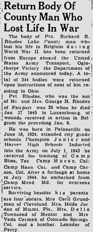 Richard Royal Rhodes, son of George Harry and Carrie Matilda (Hemenway) Rhodes, was born June 18, 1924 in Painesville, Ohio. He registered for the draft June 30, 1942, was inducted into the Army June 17, 1943 at Cleveland, Ohio, and joined Company K, 134th Infantry Regiment from the 38th Replacement Battalion on September 24, 1944. He suffered trench foot November 15 and returned to duty December 6, 1944 after recuperating. He was seriously wounded by shrapnel January 6, 1945 in the vicinity of Lutrebois, Belgium and transferred to the 16th Field Hospital where he died from his wounds January 17, 1945. Pvt Richard R Rhodes is buried at Montville Cemetery, Montville, Ohio.