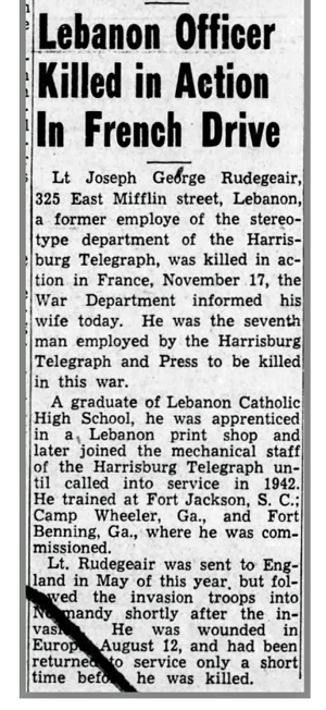 Joseph George Rudegeair, son of Raymond Nicholas and Anna Mabel (Redinger) Rudegeair, was born March 25, 1913 in Lebanon, Pennsylvania. He married Rose A. Miller February 14, 1942. He was inducted into the Army in April 1942, graduated from Officer's Candidate School January 1, 1943 and was commissioned as a 2nd Lieutenant. He trained at Fort Jackson, South Carolina, Camp Wheeler and Fort Benning, Georgia and was commission 1st Lieutenant July 22, 1943. He departed for the ETO in May 1944 and joined Company C, 134th Infantry Regiment as a Platoon Leader from the 48th Replacement Battalion August 10, 1944. He was wounded in action by artillery shell fragments 2 days later August 12, 1944 in the vicinity of Mortain, France. He returned to duty September 2 and transferred to Company M September 3, 1944. 1st Lt Joseph G Rudegeair was killed in action November 17, 1944 in the vicinity of Morhange, France. He is buried at Lorraine American Cemetery, Saint-Avold, France.