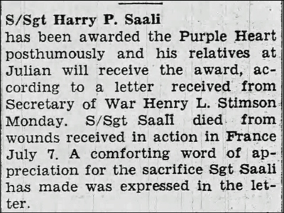 S/Sgt Harry P Saali, son of Martin and Amelie (Seigni) Saali, was born in Nebraska July 24, 1917. He was a Squad Leader in First Platoon, Company A, 134th Infantry Regiment. He was Killed in Action July 17, 1944 during the battle for St Lo, France. He is buried at Normandy American Cemetery, Colleville-sur-Mer, France.