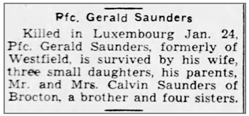 Gerald Calvin Saunders, son of Calvin Elisha and Blanche (Seekings) Saunders was born October 5, 1920 in Bemus Point, New York. He married Julia Hattibelle Abers on September 15, 1940 and the couple had 3 daughters, Dorla, Geraldine, and Beverly. He registered for the draft February 14, 1942. At the time he was living in Fredonia and working at National Worsted Mills in Falconer, New York. He was inducted into the Army May 5, 1944 at Fort Dix, New Jersey. He joined Company B, 134th Infantry Regiment as a Rifleman from the 48th Replacement Battalion on January 8 and was promoted to Private First Class January 20, 1945. Pfc Gerald C Saunders was killed by artillery shrapnel while helping to clear snipers from the recently liberated town of Troisviergesn, Luxembourg. He is buried at Willowbrook Park Cemetery, Dunkirk, New York.