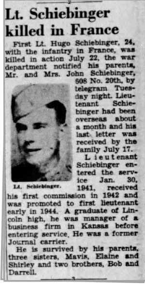 Hugo William John Schiebinger, son of John and Amanda Schiebinger, was born April 14, 1920 in Sioux Falls, South Dakota. He registered for the draft July 1, 1941. At the time he was living in Lincoln, Nebraska and working as a service man at Warner Brown Soft Water Service Company in Lincoln. He joined Company G, 134th Infantry Regiment as a Platoon Leader on July 18, 1944 from the 86th Replacement Battalion. He was killed in action July 22, 1944 during the battle for St Lo, France. 1st Lt Hugo W Schiebinger is buried at Normandy American Cemetery, Colleville-sur-Mer, France.