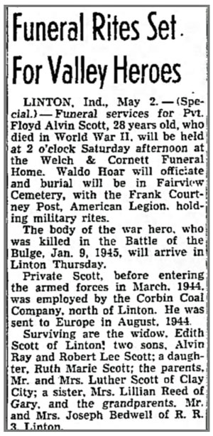 Floyd Alvin Scott, son of Luther Alexander and Elva Mae (Bedwell) Scott, was born March 27, 1916 in Linton, Indiana. He and his wife Edith Virginia Targett had 3 children, Ruth Marie, Alvin Ray, and Robert Lee. He registered for the draft October 16, 1940 and was inducted into the Army March 27, 1944 at Fort Benjamin Harrison, Indiana. He joined Company I, 134th Infantry Regiment from the 83rd Replacement Battalion, December 19, 1944 and served as a Rifleman. He was promoted to Private First Class December 26, 1944. Pfc Floyd A Scott was killed in action January 9, 1945 in Belgium as the Company was driving the Germans from the town of Lutrbois, Belgium. He is buried at Fairview Cemetery, Linton, Indiana.