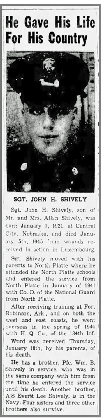 John Henry Shively, son of Alan Byron and Cleo (Bohannen/Whitney) Shively, was born January 7, 1921 in Central City, Nebraska. His family relocated to North Platte, Nebraska where he attended school. He served in the Nebraska National Guard and was inducted into Federal service at North Platte on December 23, 1940. He served in Headquarters Company 1st Battalion, 134th Infantry Regiment, 35th Infantry Division. He was promoted from Private First Class to Corporal on October 2, 1944 and was again promoted to Sergeant on January 5, 1945. That same day he was seriously wounded in action while attacking south from Marvie toward Lutrebois, Belgium, just south of Bastogne. Sergeant John H Shively died of his wounds January 5, 1945 and is buried at Fort McPherson National Cemetery, Maxwell, Nebraska.