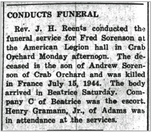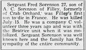 Freddie Andrew Sorenson, son of Andrew Christian and Carrie (Strawder) Sorenson, was born August 17, 1916 in Filley, Nebraska. He registered for the draft October 16, 1940 and was inducted into the Army February 18, 1941. Before entering the service he was engaged in farming with his father on a farm northeast of Filley. Sgt Freddie A Sorenson was a Squad Leader in the Third Platoon, Company C, 134th Infantry Regiment. He was killed in action July 15, 1944 during the battle for St Lo, France. He was awarded the Silver Star Medal for gallantry during the battle in which he died. He is buried at Crab Orchard Cemetery, Crab Orchard, Nebraska.